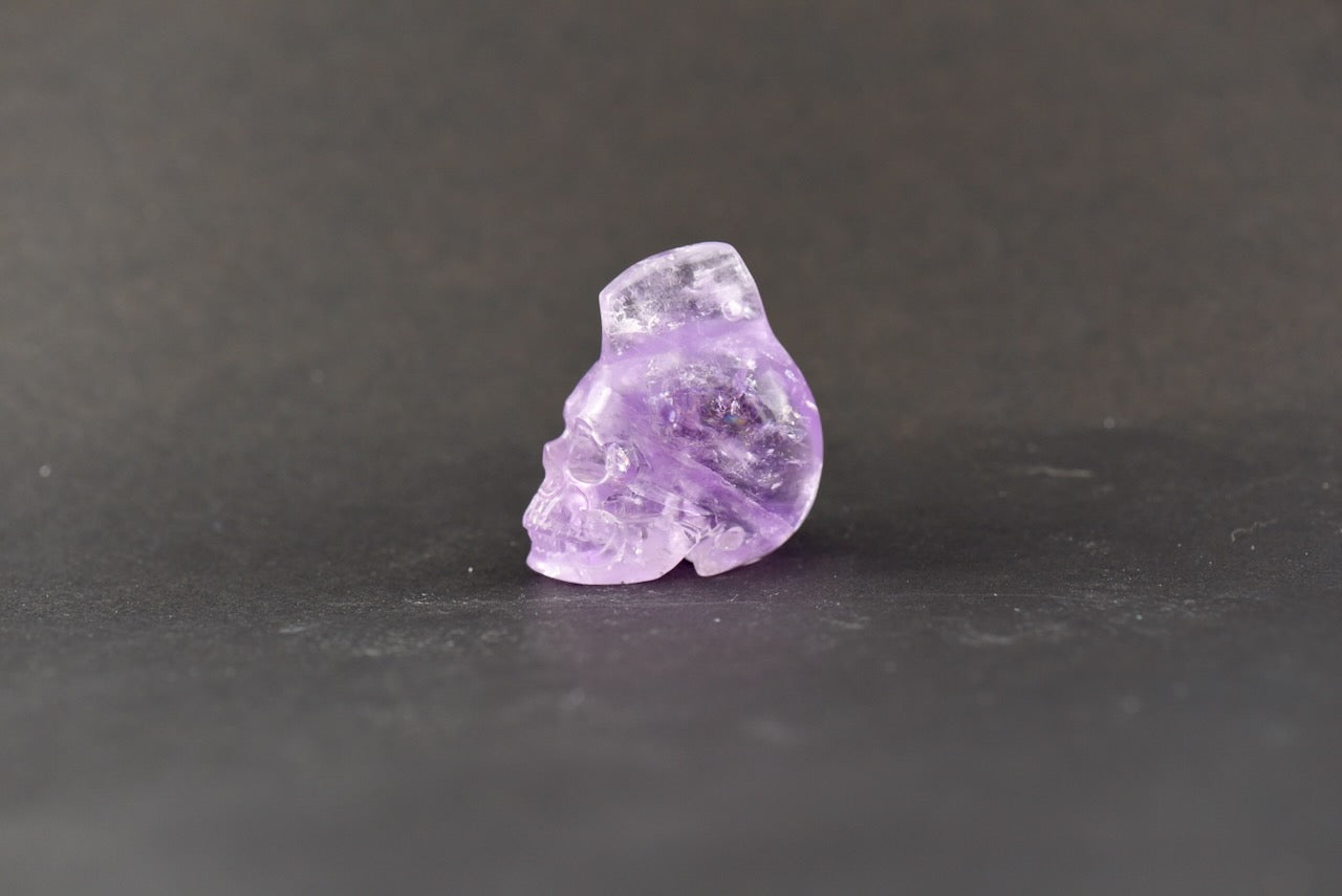 The Amethyst Mohawk Skull stands out with its bold, distinctive purple hues and the striking, natural formation of crystal growths along the top, resembling a mohawk. This unique feature adds a dynamic, energetic quality to the skull, enhancing its ability to amplify spiritual awareness and intuition. The deep purple tones, with occasional inclusions and variations, invite a sense of calm while empowering personal transformation. This skull is a powerful tool for meditation and emotional healing, channeling both clarity and protection.