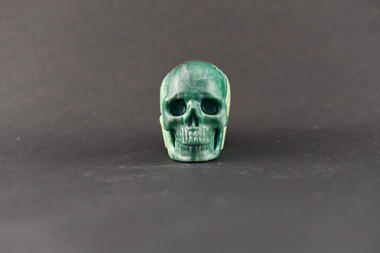 The Verdite Skull features rich green tones with swirling patterns of brown, gold, or darker green, giving it a vibrant, earthy appearance. Natural inclusions and layered textures add depth and uniqueness to each piece. Energetically, this skull supports wisdom, ancient knowledge, and inner strength, making it a powerful tool for grounding and spiritual growth.
