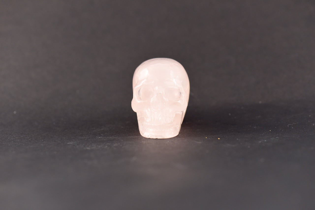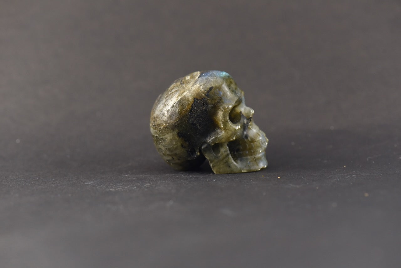 The Labradorite Skull shimmers in shades of grey with vibrant flashes of blue across the crown, known as labradorescence, revealing its mystical and otherworldly nature. This is a solid, high-quality piece of labradorite with strong visual presence. Energetically, it enhances intuition, protection, and transformation, making it a powerful guide for spiritual awakening and inner discovery. Its shifting light invites deeper perception, supporting those navigating change and seeking truth beyond the surface.