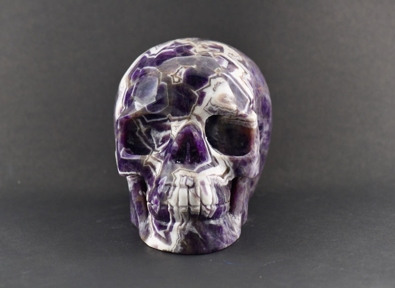 This Dream Amethyst Skull is a captivating piece, blending deep violet tones with soft lavender and white banding that flow like mystical currents. Unique inclusions and natural veining enhance its ethereal beauty, giving it an almost otherworldly presence. Energetically, Askaë radiates calm, intuition, and spiritual insight, making it a powerful ally for inner exploration. This skull invites you to dream deeper, trust your instincts, and embrace transformation.