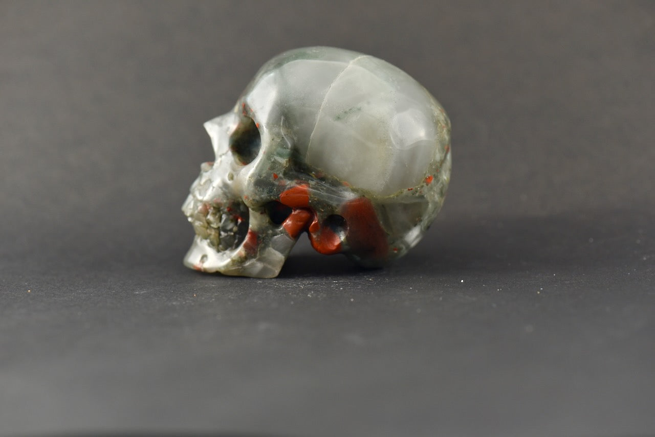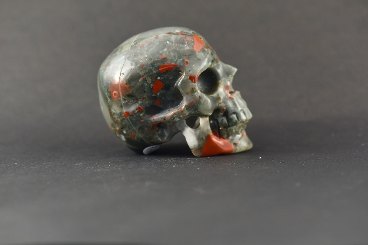 The Bloodstone Skull is a deep green crystal accented with distinctive red or brown flecks, symbolizing courage and vitality. These natural markings resemble drops of blood, giving each skull a unique and powerful appearance. Energetically, it offers grounding, protection, and a boost in physical and emotional strength, making it a supportive ally during times of challenge or transformation.